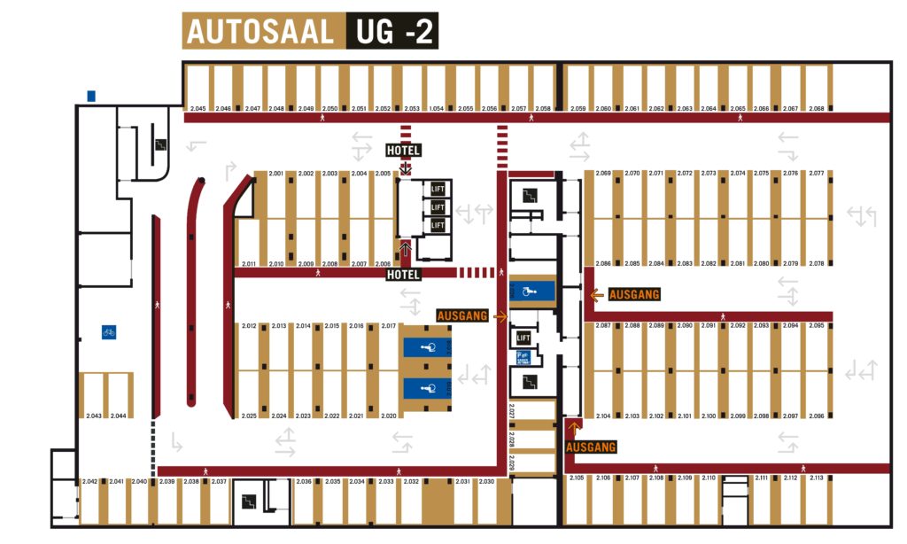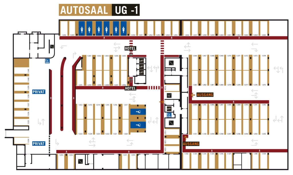 Auf unseren Plänen findest du die gekennzeichneten Stellen für Aufzüge und reservierte Behindertenparkplätze.